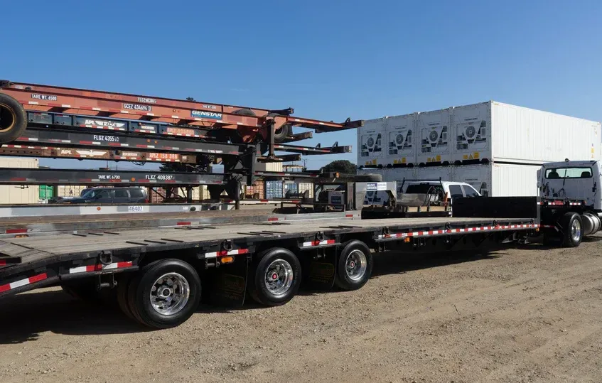 Delivery trucks are equipped with a gooseneck tilt-bed trailer to facilitate smooth offloading. This method ensures containers can be placed accurately and efficiently, minimizing the time spent on-site.