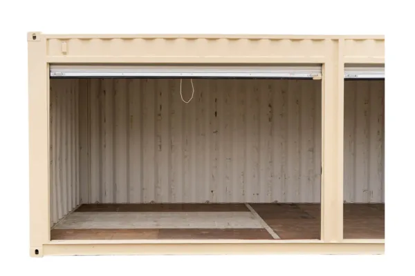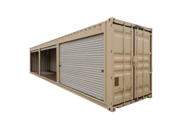 Roll-up doors are one of our most common modifications. These garage-style doors allow for quick and easy access on any side of your container, come in lengths of 3’6″, 4′, 6′, 8′, 10′ and 12′ wide (6′ and 8′ are the most common, thus installed in the quickest time frame), and are great when installed opposite the swing doors giving you access from both ends of the container.