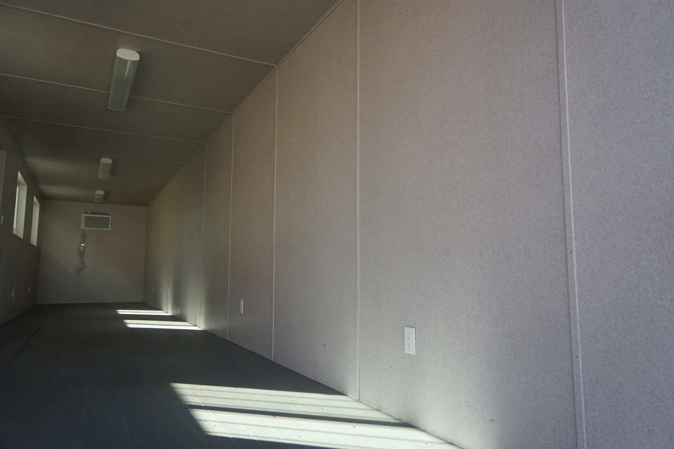 The workspace interior showcases vinyl-wrapped plywood walls that balance functionality with longevity, featuring a calm color palette that establishes a professional, welcoming environment suitable for any business aesthetic. This mobile office solution provides weatherproof security, simple relocation capabilities, and extensive customization potential. It represents an ideal choice for organizations requiring adaptable office facilities that can move efficiently between project sites and operational locations.