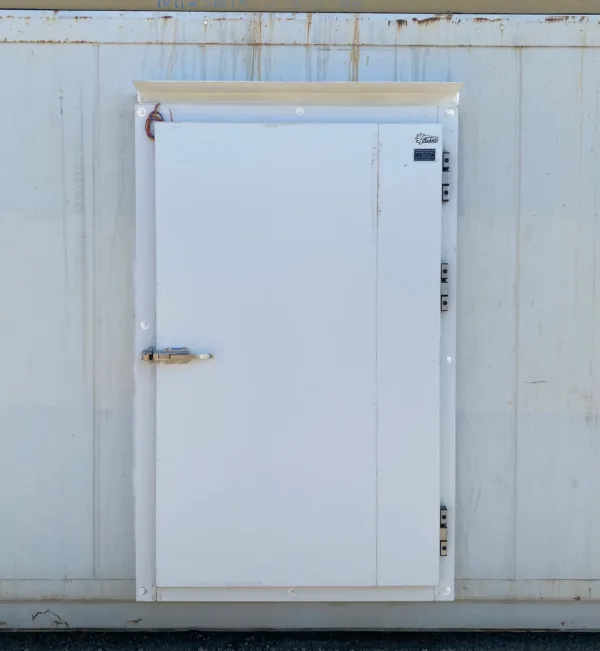 The door typically features a heavy-duty build with insulated panels to maintain temperature integrity within the refrigerated container. Its construction is designed to provide an effective barrier against temperature fluctuations, ensuring optimal conditions for storing or processing meat products.
